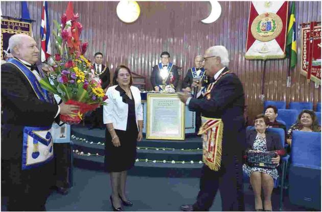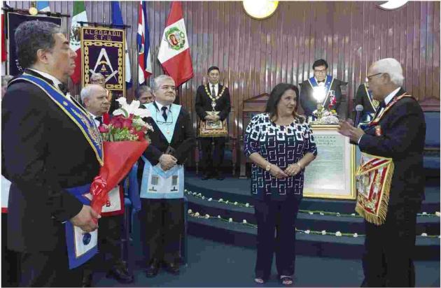 Continuando con el programa, el M.·.R.·.H.·. Carlos Antonio Tejeda Rojas, Gran Maestro de la M.·.R.·. Gran Logia de los AA.·. LL.·. y AA.·. Masones de la República del Perú, a nombre de la Gran Logia del Perú y en representación de la Madre Masónica, hizo entrega de un arreglo floral a su esposa, nuestra muy querida cuñada Fany León de Tejeda y luego, también hizo lo mismo con nuestra querida cuñada Beatriz Govea del Valle, esposa del R.·.H.·. Jorge Ponce Carranza, Se- gundo Vigilantes de la Gran Logia del Perú.