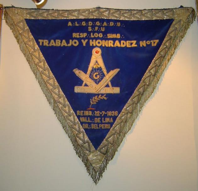 Estandarte de la R.·.L.·.S.·. Trabajo y Honrades N° 17, fundada en el Vall.·. de Sucre, Or.·. de Bolivia y reinstalada el 12 de julio de 1936 E.·.V.·. en el Vall.·. de Lima, Or.·. del Perú.