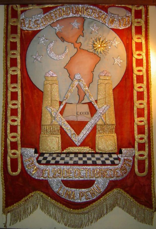 Primer Estandarte de la Actual R.·.L.·.S.·. Andrés Cordano Cavagnaro N° 154, antes de su incorporación a la Gran Logia del Perú