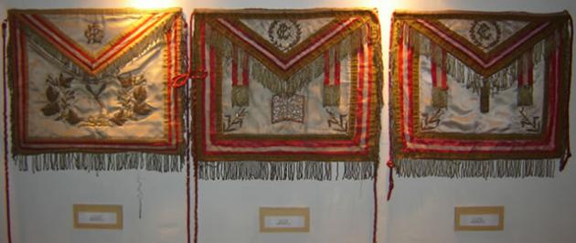 A la drecha y en primer plano, antiguos mandiles de la Gran Logia del Perú, usados por los Grandes Inspectores Regionales y Zonales.