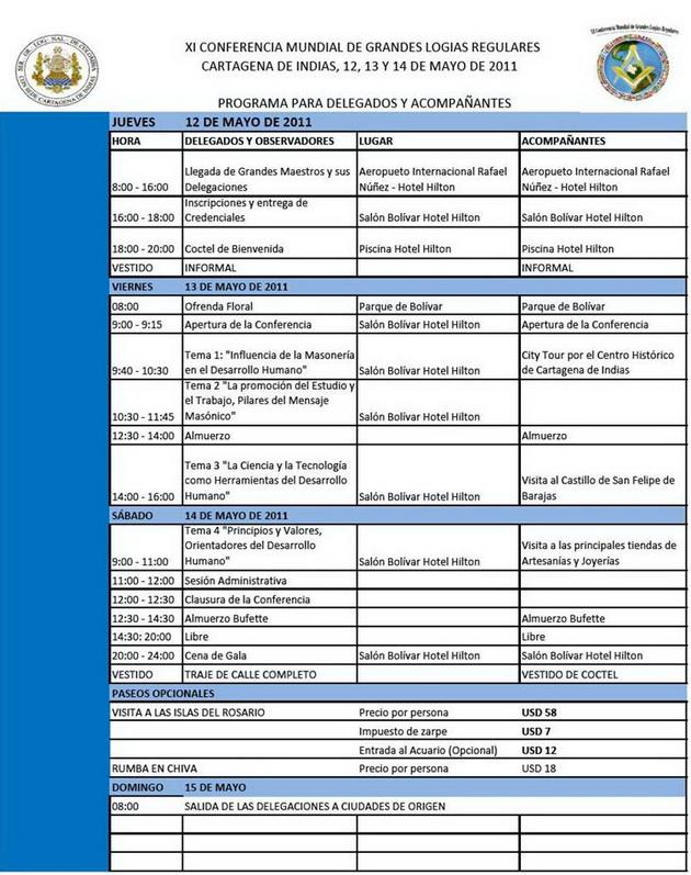 A continuación se tiene el calendario de actividades que se está cumpliendo en Cartagena de Indias, Colombia, en el marco de la XI Conferencia Mundial de Grandes Logias Regulares que se desarrolla a partir de las 12:00 horas, hora local de hoy 12 de mayo, hasta el 14 de mayo del año en curso, de la que participa el M.·.R.·.H.·. Víctor Augusto Ravines Alfaro, Gran Maestro de la M.·.R.·. Gran Logia de los AA.·. LL.·. y AA.·. Masones de la República del Perú.
