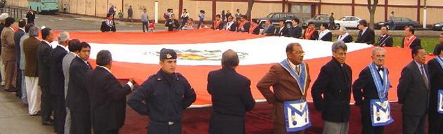 A continuación se procedió al ingreso en procesión del inmensa pabellón nacional portado por los VV.·. MM.·. de las Logias participantes, para a continuación ser izado en el asta monumental por el M.·.R.·.H.·. Víctor Augusto Ravines Alfaro, Gran Maestro de la M.·.R.·. Gran Logia de los AA.·. LL.·. y AA.·. Masones de la República del Perú y el R.·.H.·. Moisés Cristóbal Torres, V.·.M.·. de la B.·.R.·.L.·.S.·. Francisco Bolognesi Nº 48 del Vall.·. de Lima, luego que pabellón nacional llegara al tope el mástil se cantó el Himno nacional del Perú en medio de mucho recogimiento y profunda unción patriótica, la misma que culminó en un ¡¡¡VIVA EL PERÚ!!! que resonó en toda la plaza en medio palmas y vítores.