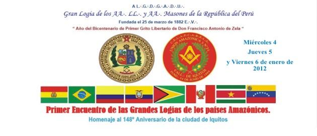 Se les hace conocer que mediante el Decreto Nº 129-632-GLP, el M.·.R.·.H.·. Víctor Augusto Ravines Alfaro, Gran Maestro de la M.·.R.·. Gran Logia de los AA.·. LL.·. y AA.·. Masones de la República del Perú, ha autorizado a la C.·.E.·.L.·.A.·.A.·.P.·.C.·.A.·.B.·.R.·.L.·.S.·. Unión Amazónica 5 Nº 25 del Vall.·. de Iquitos, la organización y desarrollo del Primer Encuentro de las Grandes Logias de los países Amazónicos, la que se realizará en conmemoración del 147º Aniversario de la fundación de la ciudad de Iquitos.