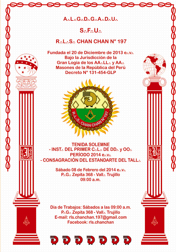 La novísima Logia Chan Chan N° 197 del Valle de Trujillo, realizó su Tenida de Instalación el Sábado 08 de Febrero, a las 09.00 horas, en el Templo de la Fraternidad ubicado en Jr. Zepita N° 368 - Trujillo. Un gran acontecimiento de regocijo por el aumento de la membresía para la Gran Logia del Perú.