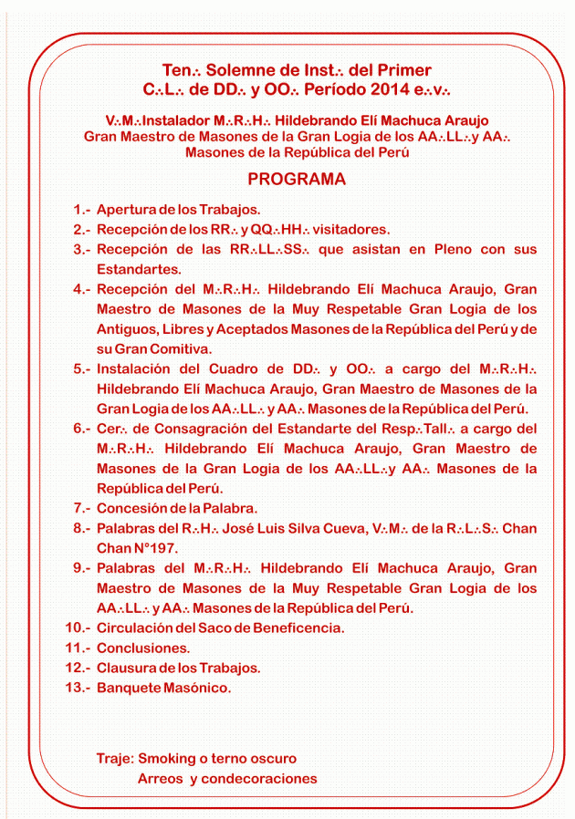En la ceremonia estuvieron presentes delegaciones de más de 28 logias del país, y una vez formados todos en el parvis, después de abierta la puerta, se estableció el parlamento ceremonial que corresponde al ritual del Lev.·. de CCol.·. de una logia entre el M.·.R.·.H.·. Hildebrando Eli Machuca Araujo, Gran Maestro de la M.·.R.·. Gran Logia del Perú y el R.·.H.·. José Luis Silva Cueva, futuro primer V.·.M.·., de la R.·.L.·.S.·. Chan Chan Nº 197 del Vall.·. de Trujillo, prosiguiendo el tenor de ancestrales rituales se estableció las primeras y fundamentales pautas que deben observar las nuevas logias al inicio de sus trabajos.