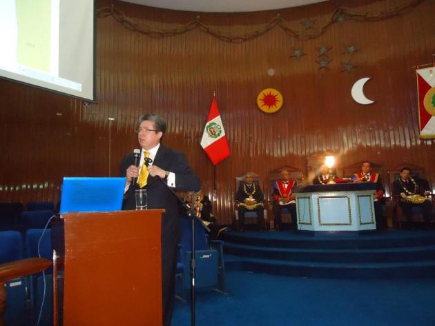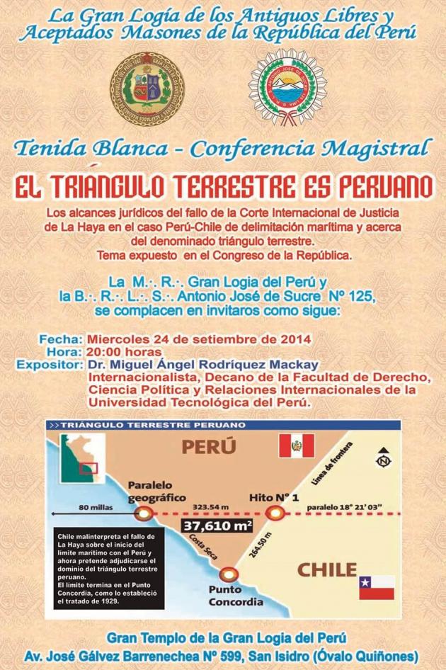 Ayer miércoles 24 de setiembre de 2014 E.·.V.·., en el Gran Templo de la sede central Julio F. de Iriarte de la Gran Logia del Perú, de la Av. José Gálvez Barrenechea Nº 599, San Isidro, ejecutando lo dispuesto por el M.·.R.·.H.·. Galo Jesús Moncada Mau, Gran Maestro de la Gran Logia del Perú, se realizó la Gran Tenida Blanca en que se desarrolló la Conferencia Magistral titulada El Triángulo terrestre es peruano, a cargo del prestigioso Internacionalista Dr. Miguel Ángel Rodríguez Mackay, Decano de la Facultad de Derecho y Ciencia Política y Relaciones Internacionales de la Universidad Tecnológica del Perú.