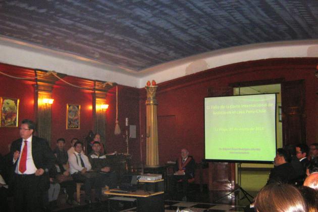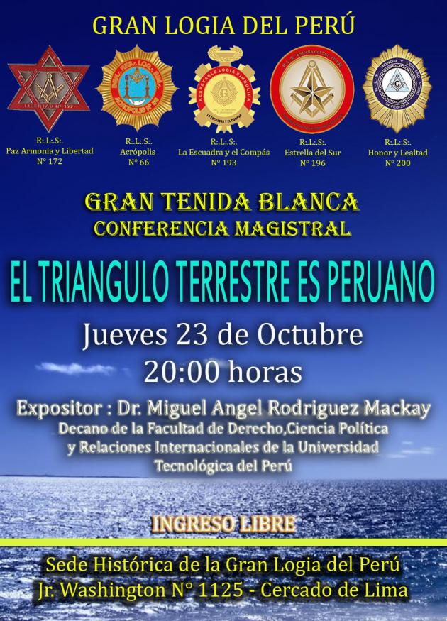 Ante un lleno total se realizó el jueves 23 de Octubre, la Gran Tenida Blanca y Conferencia Magistral "El Triángulo Terrestre es Peruano" cuyo expositor el Dr. Miguel Angel Rodriguez Mackay hizo gala de conocimiento profundo del tema sobre las implicancias del Fallo de la Corte internacional de La Haya en torno a la frontera con Chile y el desarrollo de los hechos que hicieron que el resultado sea el ya de todos conocido.
