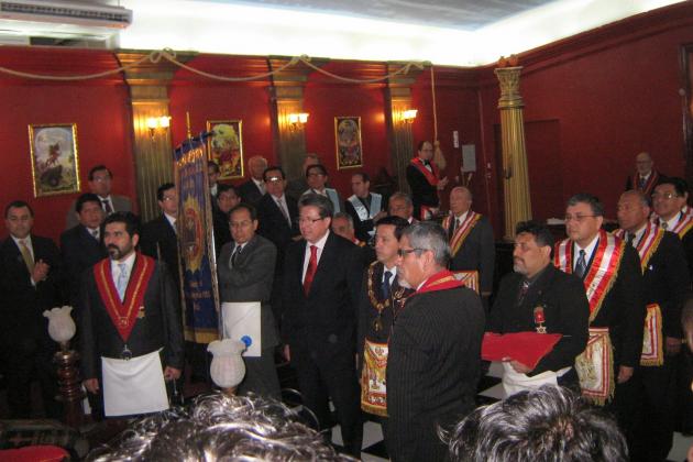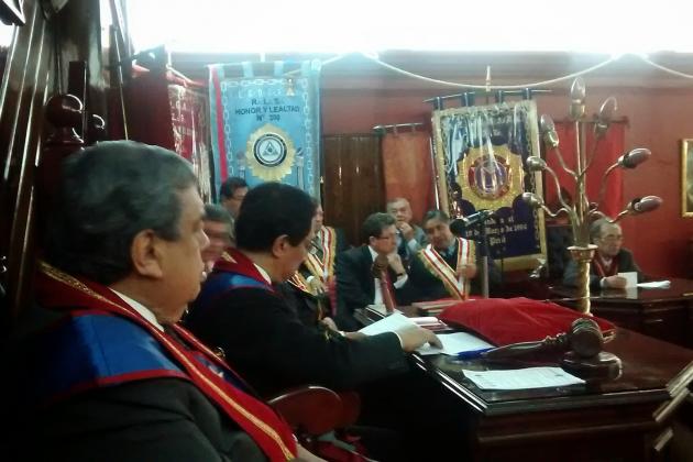 El R:.H:. Salomón Alarco V:.M:. de la R:.L:.S:. Paz Armonia y Libertad N° 172 dió inicio a los trabajos para luego recibir con los honores respectivos al R:.H:. Edgard Neyra Bardales, Vice Gran Maestro de la Orden y su Gran Comitiva, acompañado por el expositor Dr. Miguel Angel Rodriguez Mackay, quien es Decano de la Facultad de Derecho de la Universidad Tecnológica del Perú U.T.P.