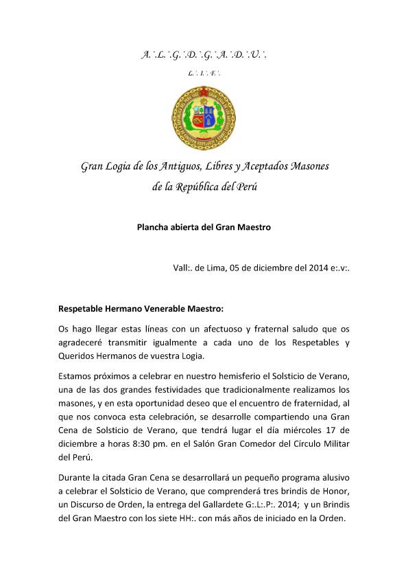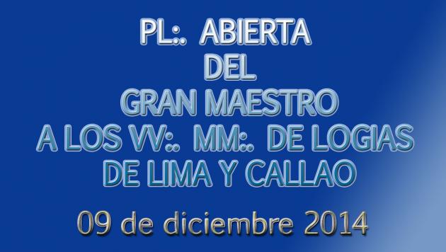 PL.·. ABIERTA DEL GRAN MAESTRO A LOS VV:.MM:. DE LOGIAS DE LIMA Y CALLAO