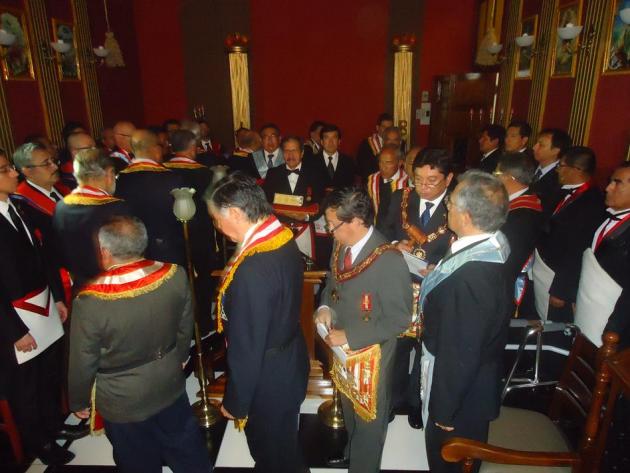 Gran Orador de la Gran Logia del Perú, el R.·.H.·. Fernando Hurtado Lizárraga, Gran Director de Ceremonias de la Gran Logia del Perú, el R.·.H.·. Alejandro Martínez Cuba, Primer Gran Diácono de la Gran Logia del Perú, el R.·.H.·. José Collado Guardia, Segundo Gran Diácono de la Gran Logia del Perú, el R.·.H.·. Carlos Alberto Yrigoyen Forno, Gran Canciller de la Gran Logia del Perú, el Q.·.H.·. Felipe Reinoso Cervantes, Gran Canciller Adjunto de la Gran Logia del Perú, el R.·.H.·. José Barco Avellaneda, Gran Secretario de las Regiones de la Gran Logia del Perú, el R.·.H.·. Félix Prieto Zavaleta, Gran Guarda mayor de la sede histórica Jesús García Maldonado de la Gran Logia del Perú del Cercado de Lima, el R.·.H.·. Fernando Britto Obregón, Gran Director de Prensa de la Gran Logia del Perú, el Q.·.H.·. Jesús Egoavil Dorregaray, Secretario Personal Adjunto del Gran Maestro, el Q.·.H.·. Jorge Saco Márquez, Secretario Personal Adjunto del Gran Maestro, además del R.·.H.·. Ramón Cueva Cruzado, Gran Inspector Regional de la Gran Región Nº 14 – Cercado de Lima.