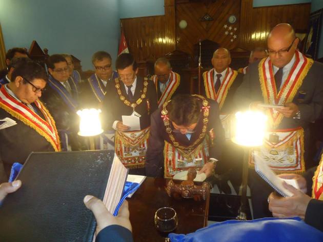 Concluida la consagración, el M.·.R.·.H.·. Galo Jesús Moncada Mau, Gran Maestro de la M.·.R.·. Gran Logia de los AA.·. LL.·. y AA.·. Masones de la República del Perú fue conducido al Or.·. seguido del R.·.H.·. Edgard Neyra Bardales, Vice Gran Maestro de la Gran Logia del Perú, mientras los miembros del Gran Cuad.·. de Grandes Dignidades y Grandes Oficiales, iban ocupando cada uno de ellos sus puestos de trabajo, a continuación el Gran Maestro abrió los trabajos de la Gran Tenida de la Gran Logia del Perú.