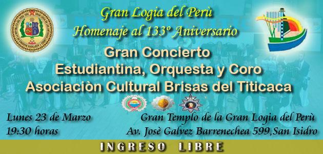 El Lunes 23 de Marzo, por indicación especial del M.·.R.·.H.·. Galo Jesús Moncada Mau, Gran Maestro de la M.·.R.·. Gran Logia de los AA.·. LL.·. y AA.·. Masones de la República del Perú, se os invita muy fraternalmente a vos a vuestro familiares, amigos y público en general al Gran Concierto de Gala a cargo de la Estudiantina, Orquesta y Coro de la prestigiosa Asociación Cultural Brisas del Titicaca, programada como sigue: