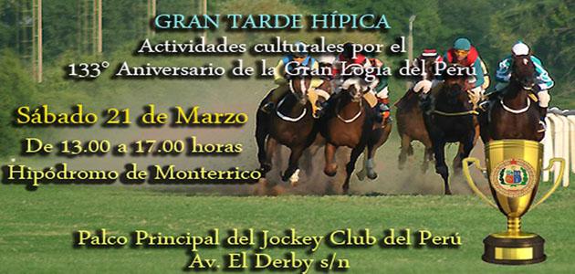El Sábado 21 de Marzo, se ha programado la Gran Tarde Hípica, en el Hipódromo de Monterrico desde las 13.00 horas hasta las 16.00 horas. Todas las carreras están referidas a la Gran Logia del Perú en el marco del |133° Aniversario.