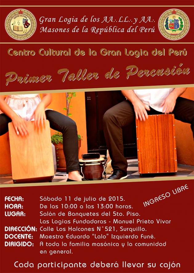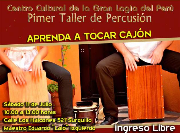 El Centro cultural de la Gran Logia del Perú ha programado el 1er. Taller de Percusión, el cajón peruano, donde los que deseen aprender a tocar el cajón puedan hacerlo el día sábado 11 de Julio de 10 a 1 p.m. en nuestra sede ubicada en la Calle Los Halcones N° 521, Surquillo. El docente será el reconocido maestro Eduardo "Lalo" Izquierdo. MAYOR INFORMACIÓN click aqui.