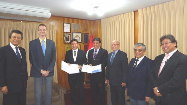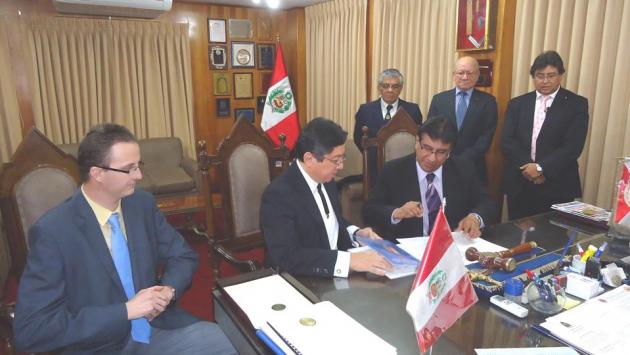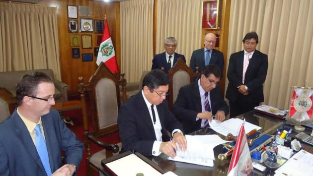 Instantes en que el M.·.R.·.H.·. Galo Jesús Moncada Mau, Gran Maestro de la M.·.R.·. Gran Logia de los AA.·. LL.·. y AA.·. Masones de la República y el Dr. Pedro C. Salomé Gamarra, Gerente General de ASISPA Perú, proceden a la firma del Convenio.