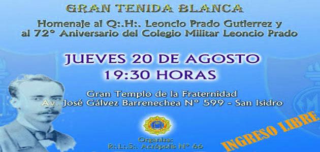 El jueves 20 de agosto de 2015 E.·.V.·., en el Gran Templo de la sede central “Julio F. de Iriarte” de la Gran Logia del Perú, de la Av. José Gálvez Barrenechea Nº 599, San Isidro, dando cumplimiento a la convocatoria que hiciera el M.·.R.·.H.·. Galo Jesús Moncada Mau, Gran Maestro de la M.·.R.·. Gran Logia de los AA.·. LL.·. y AA.·. Masones de la República del Perú, a los Past Grandes Maestros, Venerables Maestros, Ex y Past Venerables Maestros, a los Grandes Representantes de las Grandes Logias de la Amistad y Correspondencia, a nuestros Queridos Hermanos Maestros Masones, Compañeros Francmasones y Aprendices Masones y la invitación cursada a nuestros familiares, amigos y público en general, se realizó la Gran Tenida Blanca en homenaje al Q.·.H.·. Leoncio Prado Gutierrez y al 72º Aniversario de la fundación del Colegio Militar Leoncio Prado.La organización, promoción y realización de dicho homenaje estuvo a cargo de la R.·.L.·.S.·. Acrópolis Nº 66 del Vall.·. de Lima.