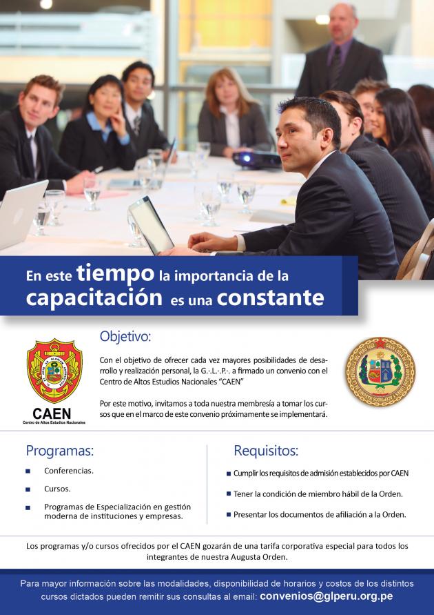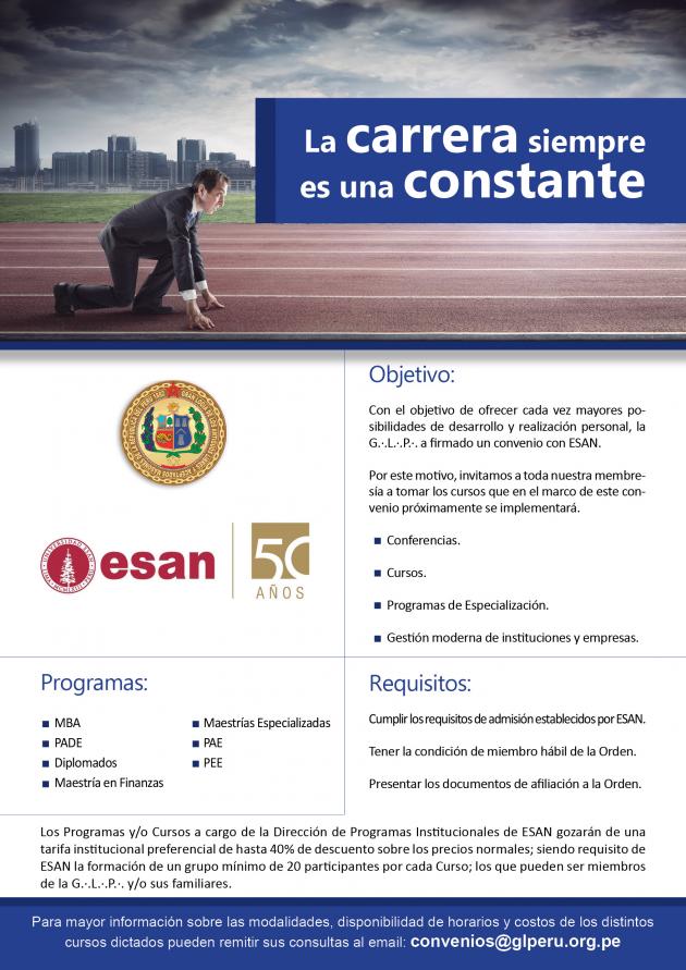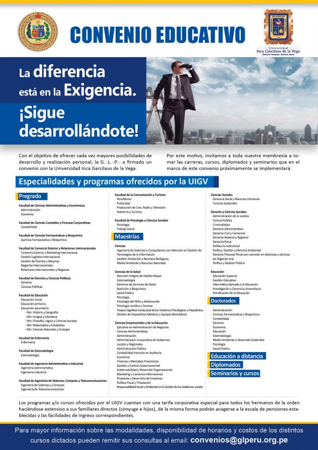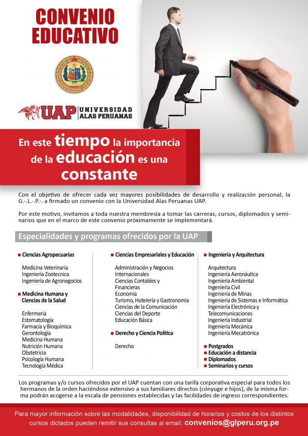 La Gran Logia del Perú,ha afirmado recientemente Convenios Educativos con prestigiosas Universiddes como son la Universidad Alas Peruanas, Universidad ESAN y Universidad Inca Garcilaso de la Vega, donde los hermanos e hijos tendrán la oportunidad de seguir estudios superiores.