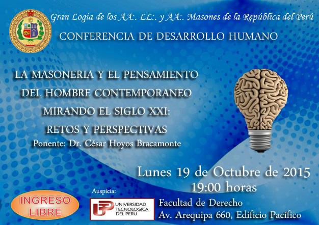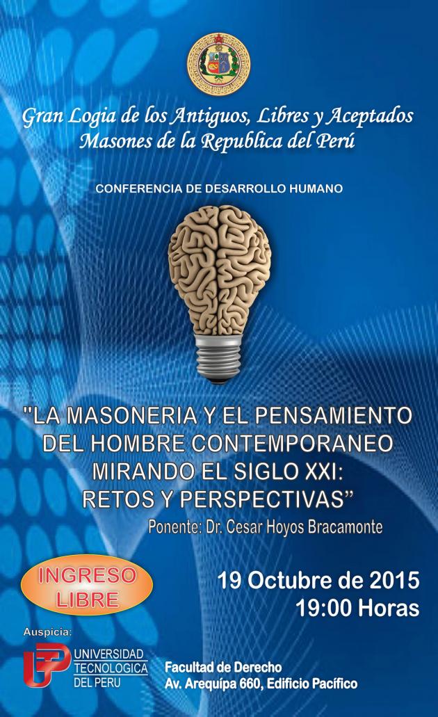 La Universidad Tecnólogica del Perú (U.T.P.) ha programado una Conferencia de Desarrollo Humano titulada "La Masonería y el pensamiento del Hombre Contemporaneo mirando el siglo XXI: Retos y perspectivas, cuyo ponente será el Dr. César Hoyor Bracamonte. Esta conferencia será el día lunes 19 de octubre a las 19.00 horas en la Facultad de Derecho de dicha universidad y todo ello en coordinación con la gran Comisión de Nueva Membresía.