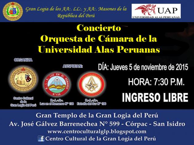La Obertura de la Òpera "La Flauta Màgica" será una de las obras que la Orquesta de Cámara UAP de la Universidad Alas Peruanas dirigida por el Maestro César Delgado Mariscal interpretará en el concierto se llevará a cabo el día jueves 05 de noviembre en el Gran Templo de la Gran Logia del Perú a las 19.30 Hrs. en la Av. José Gálvez Barrenechea No. 599, Urb. Còrpac, San Isidro. Ingreso Libre.