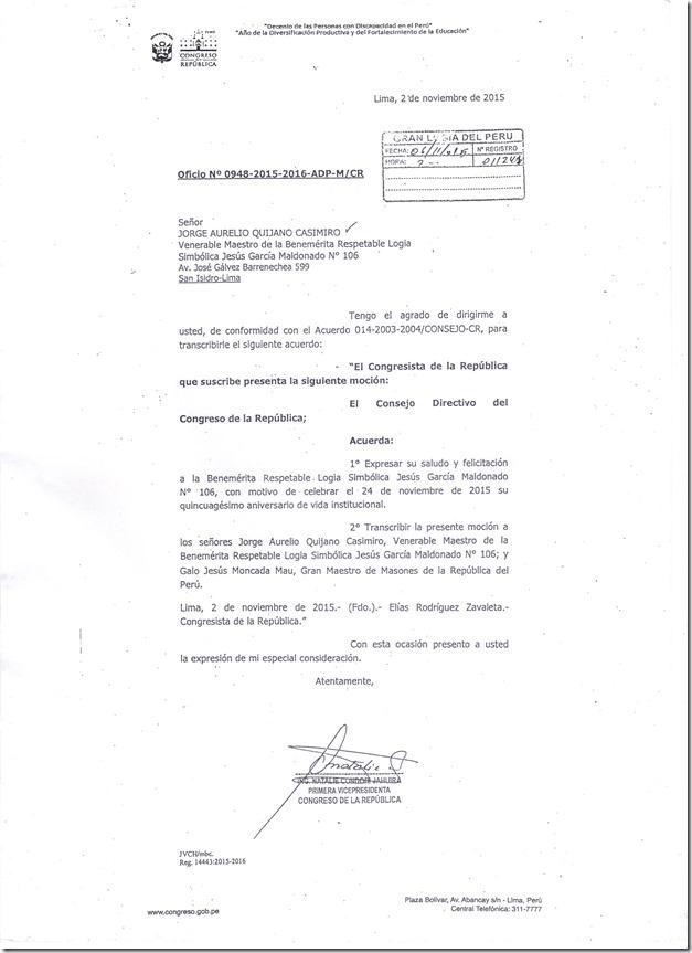 Congreso de la República saluda a Logia Jesús García Maldonado N° 106 por 50° aniversario