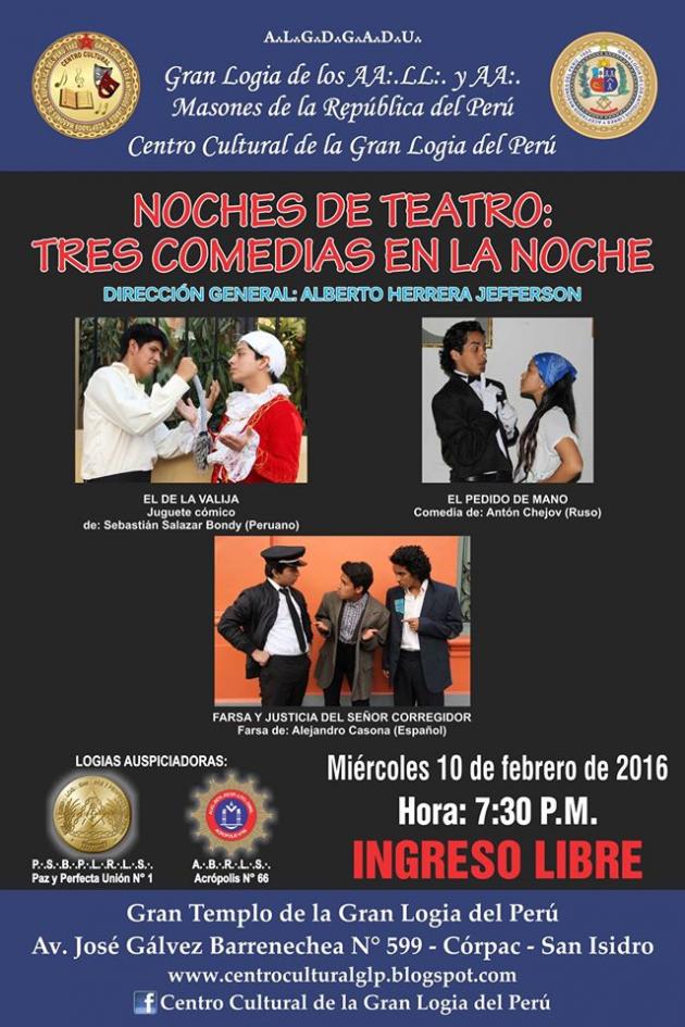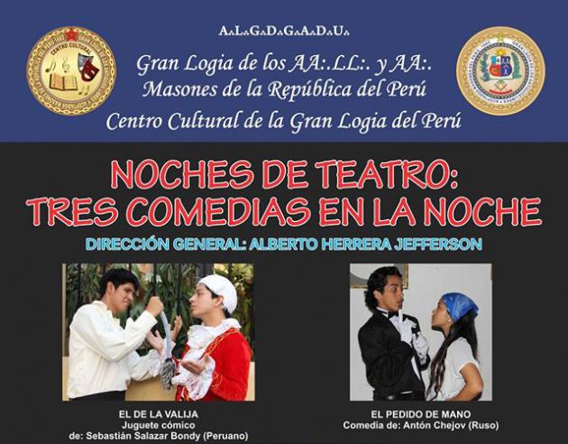 El Centro cultural de la Gran Logia del Perú dentro del cumplimiento de su misión de promover el desarrollo humano, artístico de la familia masónica y de la sociedad en general a través de las presentaciones de sus elencos, desarrollo de talleres, conciertos, conferencias, etc. y la proyección cultural, siendo así, un agente vital complementario del arte y la cultura invita a la "Noche de Teatro" en la Gran Logia del Perù con la presentación teatral de "TRES COMEDIAS EN LA NOCHE".