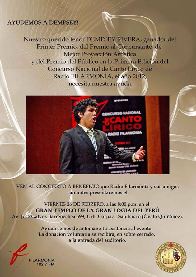 Radio Filarmonía conjuntamente con el Centro Cultural de la Gran Logia del Perú se unen en la organización del CONCIERTO LÍRICO benéfico del joven tenor peruano DEMPSEY RIVERA, ganador de la Primera Edición del Concurso Nacional Lírico de Radio Filarmonía realizado en octubre de 2012.