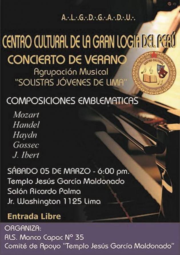 El Centro Cultural de la Gran Logia del Perú dentro del cumplimiento de su misión de promover el desarrollo humano, artístico de la familia masónica y de la sociedad en general a través de las presentaciones de sus elencos, desarrollo de talleres, conciertos, conferencias, etc. y la proyección cultural, siendo así, un agente vital complementario del arte y la cultura, conjuntamente con la R:.L:.S:. Manco Càpac No 35 y el Comité de Apoyo para la Restauración y Remodelaciòn de la Sede Històrica Jesùs Garcìa Maldonado invitan al "CONCIERTO DE VERANO" en el Templo Histórico “M:.R:.H:. Jesús García Maldonado” de la Gran Logia del Perú.