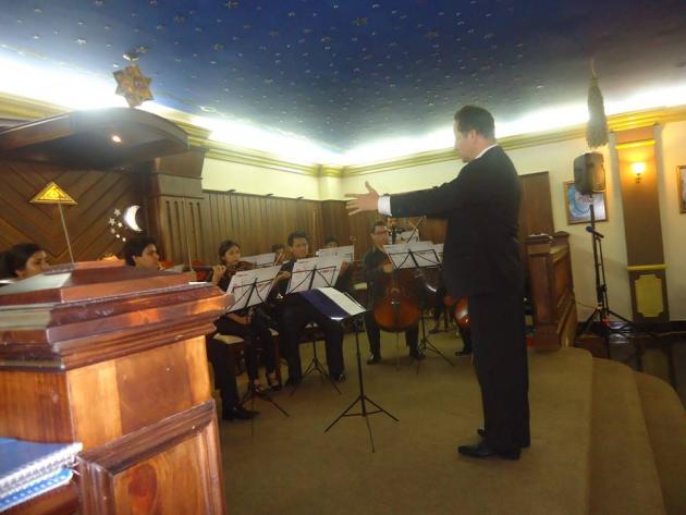 A continuación, en el templo Virtud y Unión del 1er. piso se brindó a nuestros distinguidos invitados y visitantes un Concierto de Bienvenida a cargo de la prestigiosa Orquesta de Cámara de la Universidad Alas Peruanas bajo la dirección musical del Maestro César Delgado Mariscal y la extraordinaria participación de la Soprano María del Carmen Rodríguez.