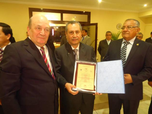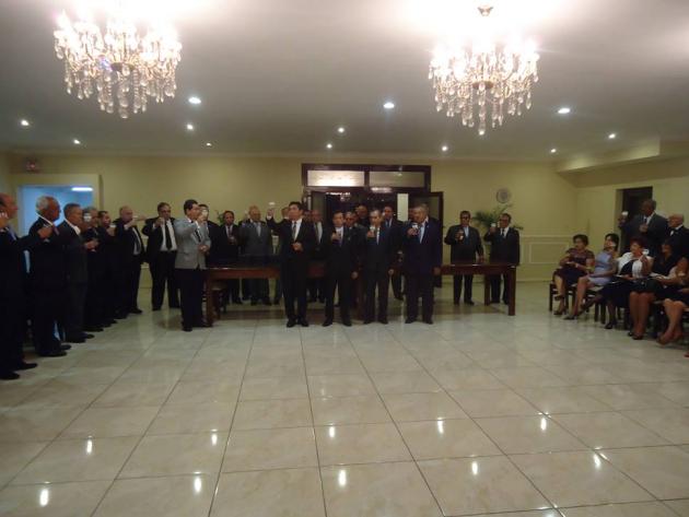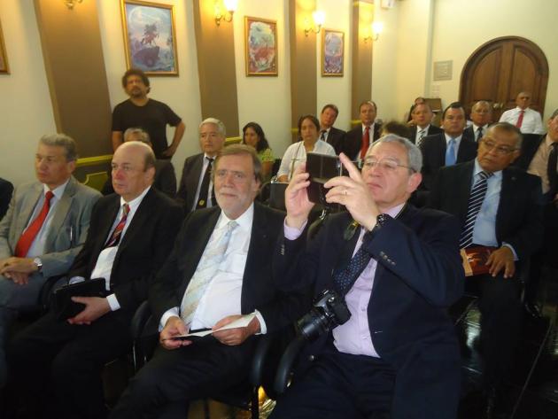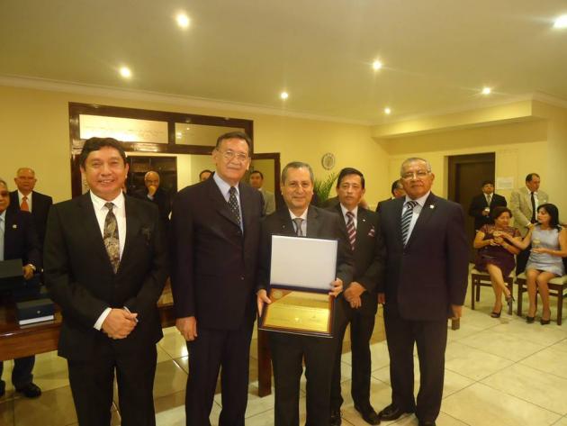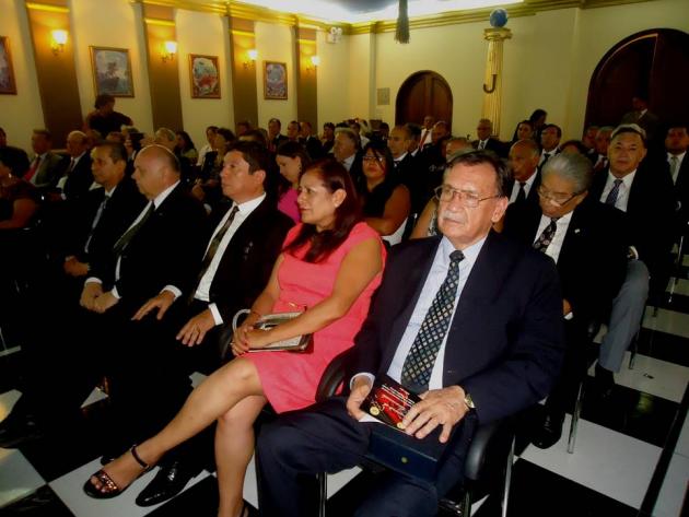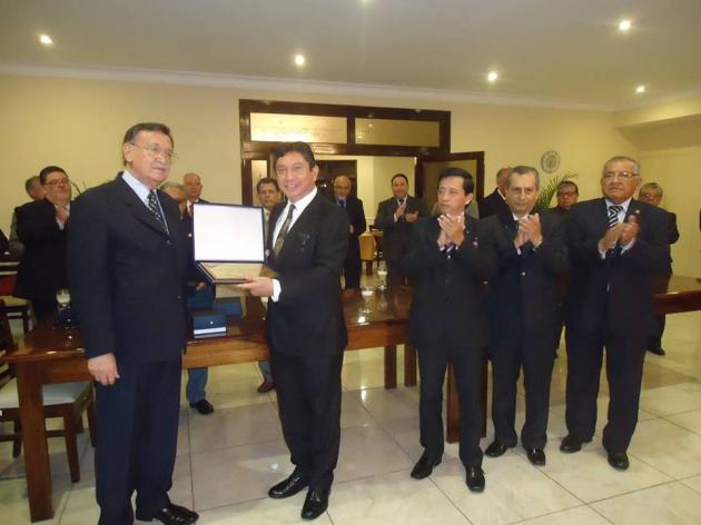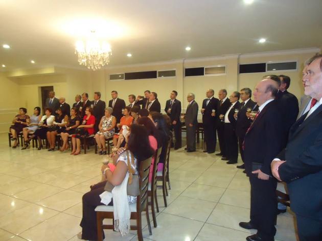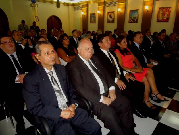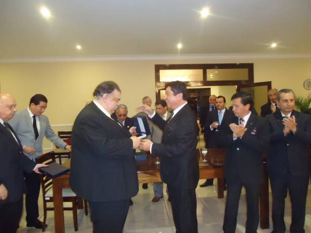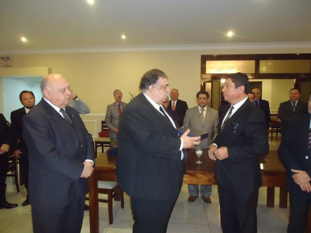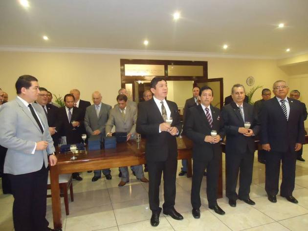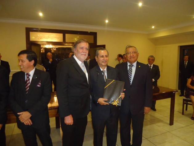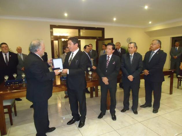Después del Brindis, se realizó el intercambio de presentes entre el M.·.R.·.H.·. Galo Jesús Moncada Mau, Gran Maestro de la M.·.R.·. Gran Logia de los AA.·. LL.·. y AA.·. Masones de la República del Perú y los Grandes Maestros y Delegaciones visitantes.
