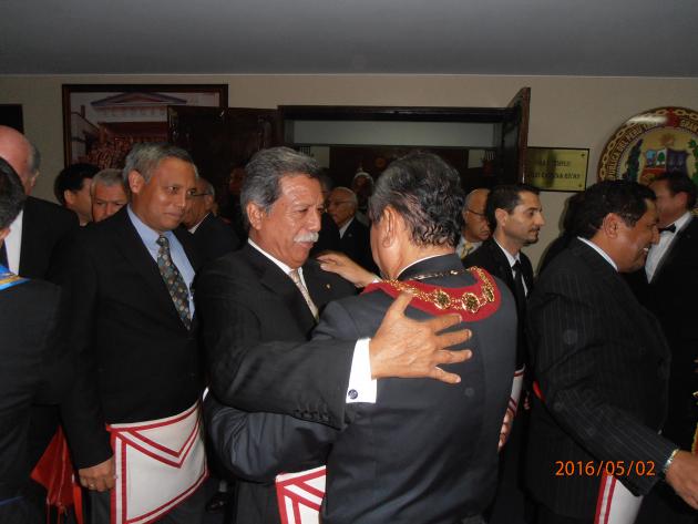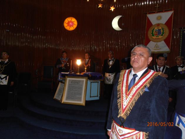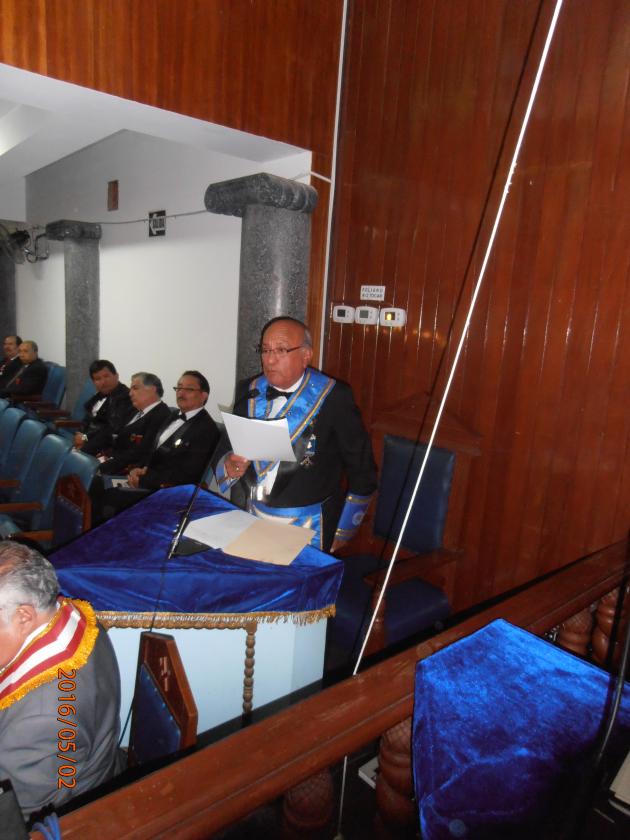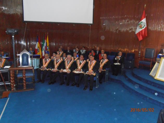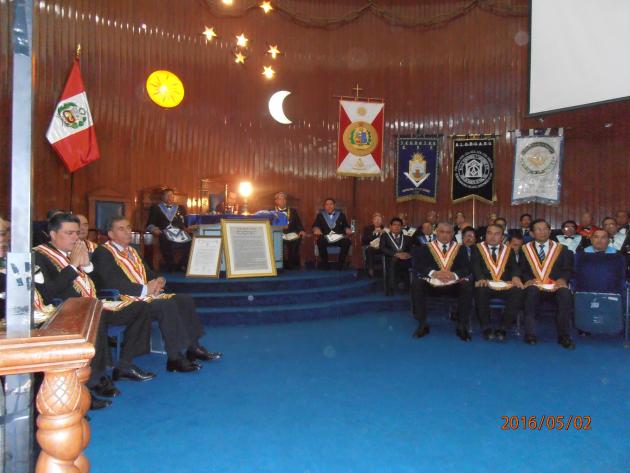 El Lunes, 02 de Mayo del 2016 (e:.v:.), en el Gran Temp:. M:.R:.H:. "Emilio Cassinas Rivas", se llevo a cabo la Gran Tenida Solemne, por Decreto N°134-024-GLP, organizada por la B:.R:.L:.S:. "2 de Mayo", apoyada por las RR:.LL:.SS:. del Vall:. del Callao. El R:.H:. Juan Antonio Arrunategui Aguirre, dirigió los trabajos. Presidio el M:.R:.H:. Cesar Bazan Naveda, G:.M:. de Masones de la G:.L:.P:., acompañado de su Gran Comitiva. En el Ort:. lo acompañaron, el I:.P:.H:. Héctor Arturo Farfán Stamp, Sob:. G:.Comend:. del Supremo Consejo del Grado 33° para la República del Perú. Acompañaron igualmente los RR:.HH:. Pablo Villanueva Villacorta, V:.M:. de la R:.L:.S:. "Constancia y Concordia" N°11; César Díaz Otoya, V:.M:. de la R:.L:.S:. "Independencia" N°31; Víctor Lamas Ríos, V:.M:. de la R:.L:.S:. "Constitución" N°100