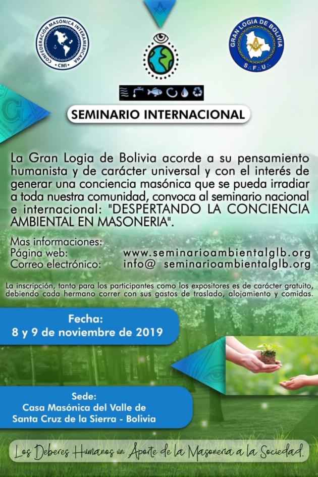 Entre los días 8 y 9 de noviembre se realizará en la Gran Logia de Bolivia, el Seminario "Despertando La Conciencia Ambiental en Masonería" cuya finalidad es proponer lineamientos y estrategias para promover su desarrollo en estricto respeto en los valores masónicos.