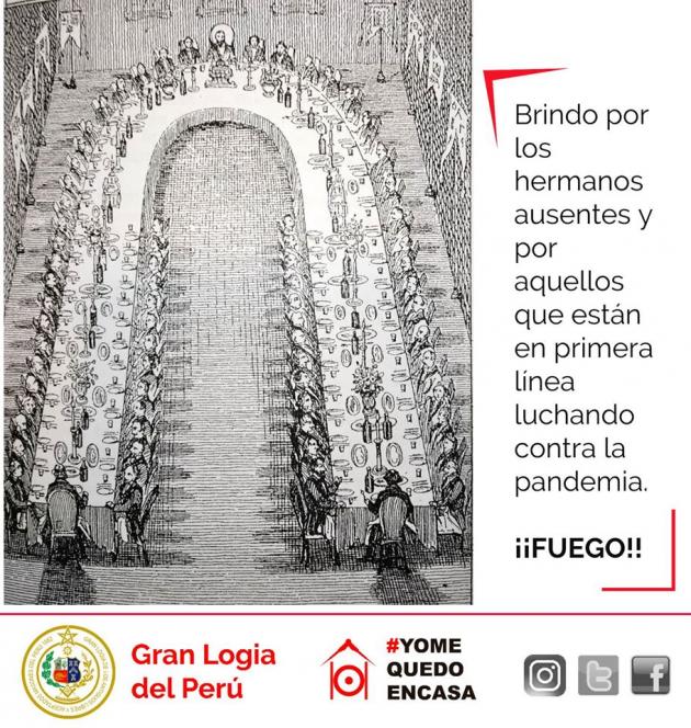Brindemos por los hermanos ausentes y por aquellos que están en primera línea luchando contra la pandemia. ¡Fuego! Así como en la masonería de Inglaterra, las logias peruanas del Rito Escocés Antiguo y Aceptado también celebraban banquetes masónicos en los que brindaban usando alegorías militares. Cada vez que se bebía el oficiante decía: “¡Fuego, buen fuego, perfecto fuego!” y los demás repetían. La ilustración así como los brindis aparecen en la Enciclopedia Masónica de Juan Bautista Casanave publicada en el Callao en 1859