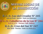 Tres nuevas Logias se han creado en la Gran Logia del Perú. La Logia Cruz del Sur N° 205, Caballeros de la Luz N° 206 y Cruz del Sur N° 207. Dos de ellas trabajarán en la sede de Los Halcones - Surquillo y una en la ciudad de Sullana - Piura.